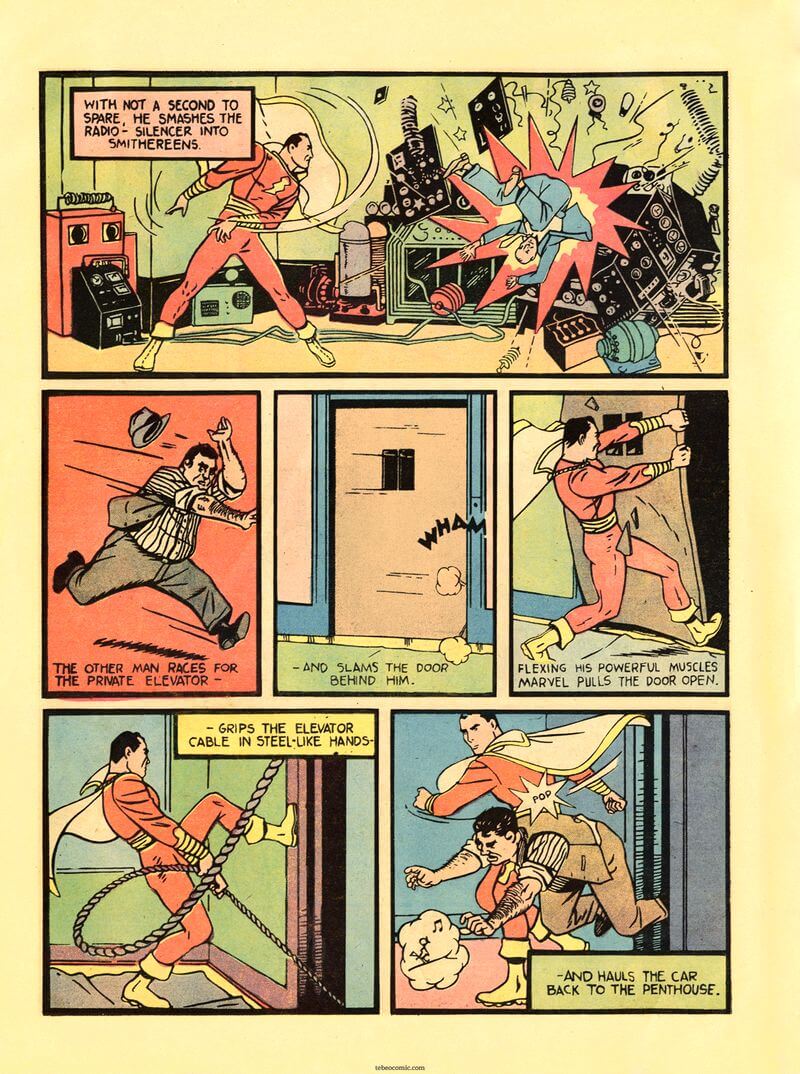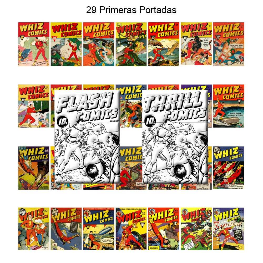 El primer número publicado de Whiz Comics fue el n.º 2, con fecha de portada de febrero de 1940. Fawcett creó dos números 1 en blanco y negro para captar publicidad y asegurar los derechos de autor del material. Los dos ejemplares eran idénticos, pero llevaban títulos diferentes: Flash Comics y Thrill Comics (Estos números 1 los hemos juntado en 1 PDF); el personaje del Capitán Marvel se llamaba «Capitán Trueno», como lo oyes, en una historia casi idéntica.